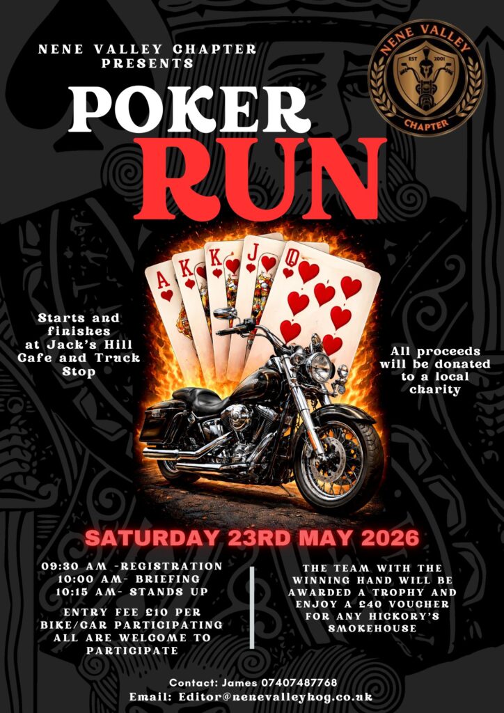 Get ready for the Nene Valley Chapter Poker Run 2026! A day packed with stunning locations, great company, and an exciting prize up for grabs — all in the name of charity. Let’s come together, ride out, and make a difference by presenting a well-deserved charity with a fantastic gift from Nene Valley. So fuel up, gear up, and let’s ride!